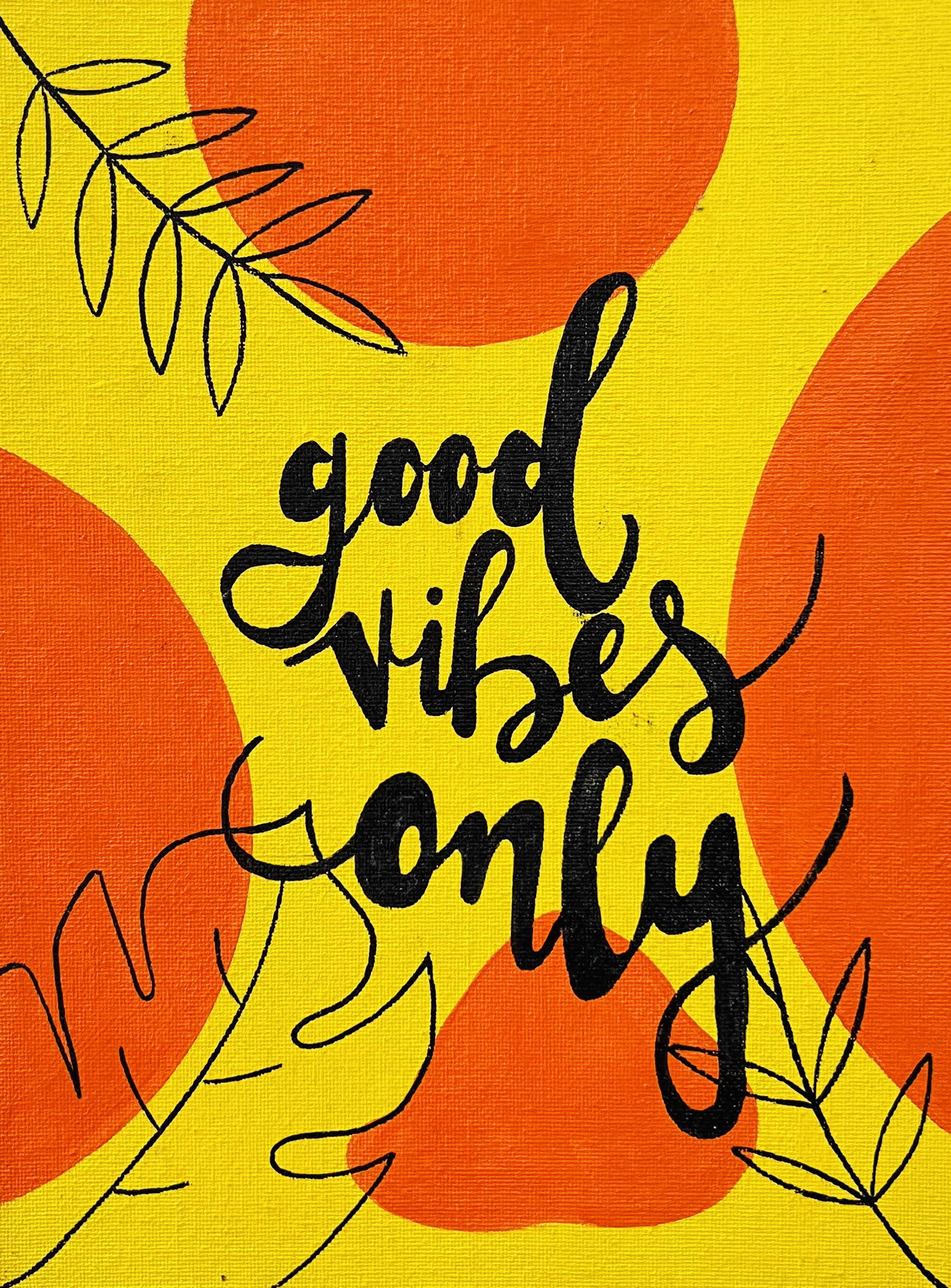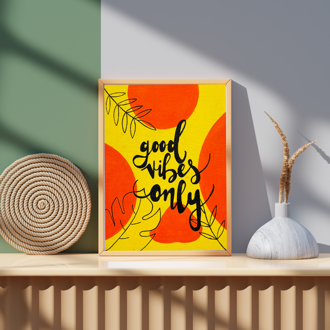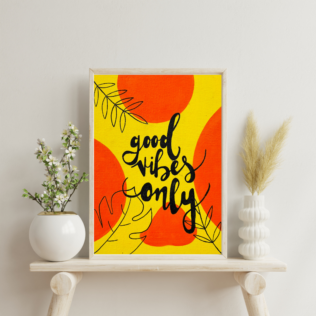 A radiant splash of positivity, this artwork features the handwritten phrase “good vibes only” set against a vivid yellow canvas with playful orange circles and delicate black leaf sketches. It’s a cheerful reminder to keep the energy light and uplifting. Perfect for entryways, dorm rooms, or anywhere that could use a dose of optimism and style.